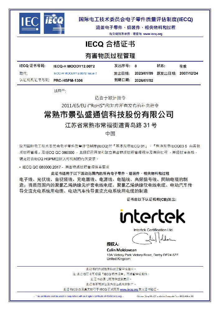 有害物質(zhì)過程管理體系證書
